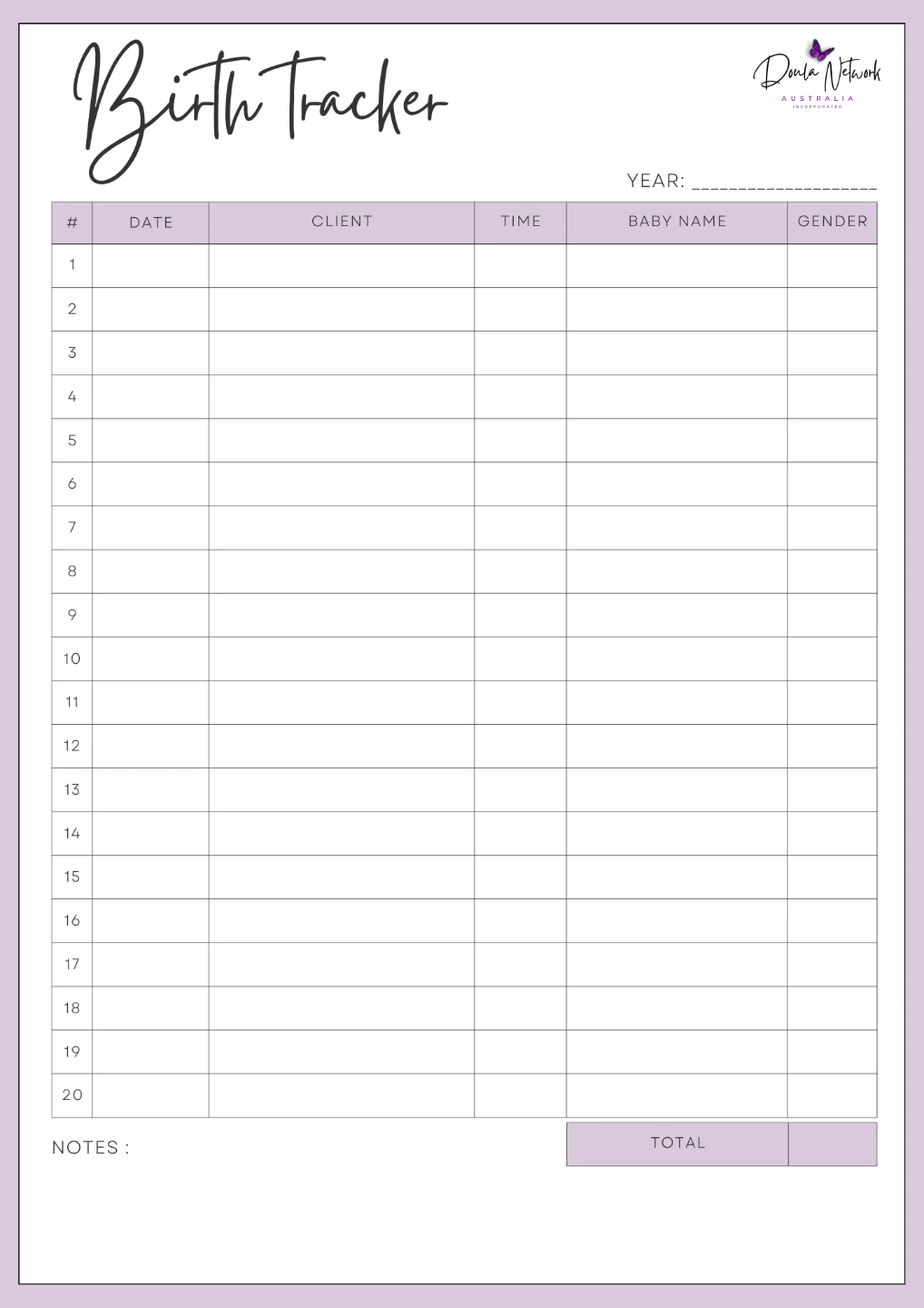 Keep track of your births, with our "Birth Tracker" this handy doula handout will help you keep track of a clients baby's time of birth, name and gender and track your total births for the year.